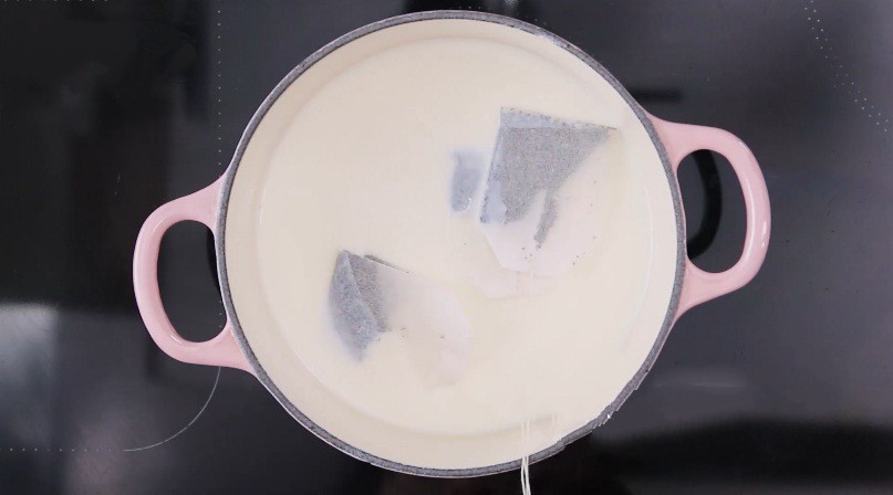 Đổ sữa tươi vào nồi, thêm kem tươi và đường vào đun ở nhiệt độ thấp và khuấy cho đường tan rồi tắt bếp. Thêm trà túi lọc vào và ngâm khoảng 15 phút rồi bỏ gói trà ra.