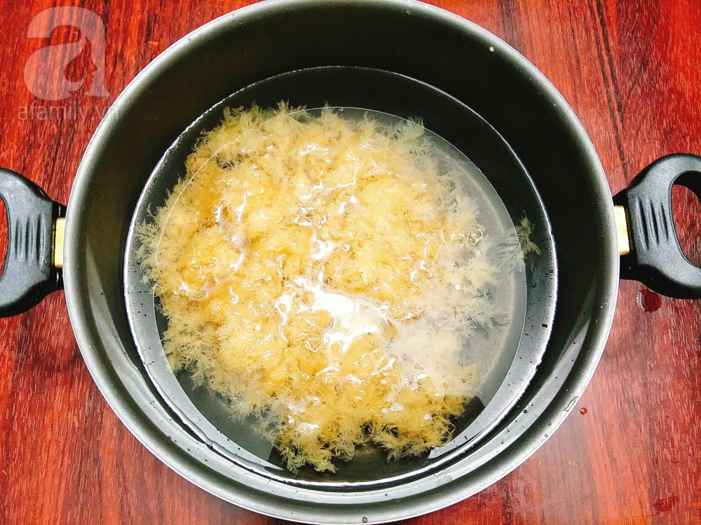 Cho 2 lít nước, vài giọt giấm và rong biển vào nồi, bật bếp nấu cho sôi sau đó hạ lửa nhỏ và nấu khoảng 1 tiếng để rong biển ra hết chất.