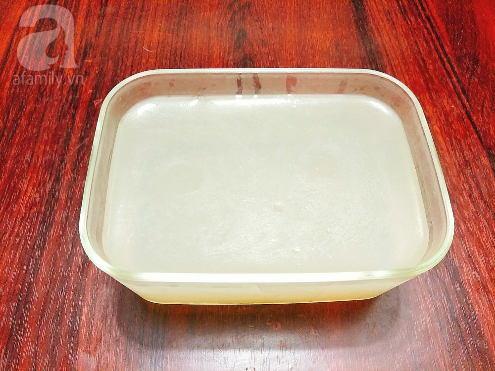Đổ rong biển lọc qua rây để lấy nước rong biển, phần bã bỏ đi sau đó rót nước rong biển vào khuôn chờ cho nguội thì đem cất ngăn mát tủ lạnh cho rau câu rong biển đông lại.