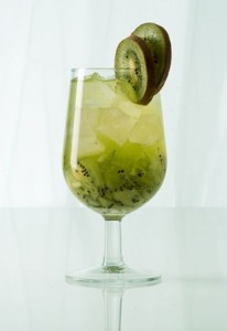 3. Cho kiwi cắt nhỏ, nước chanh tươi, đường kính, đá viên vào máy xay sinh tố đánh nhuyễn.