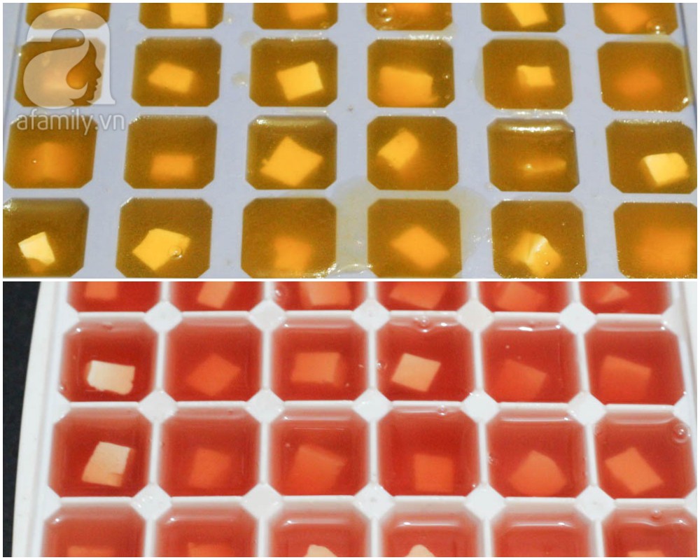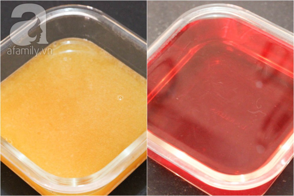 Trộn đều 3g thạch với 40g đường. Cho 100ml nước vào nồi đun sôi, đổ hỗn hợp đường và bột thạch vào nồi khuấy đều. Tắt bếp, đổ 200ml nước cam vào nồi khuấy đều. Múc thạch vào khuôn đã xếp sẵn phô mai chờ thạch đông. Thực hiện tương tự với phần nước rau dền.