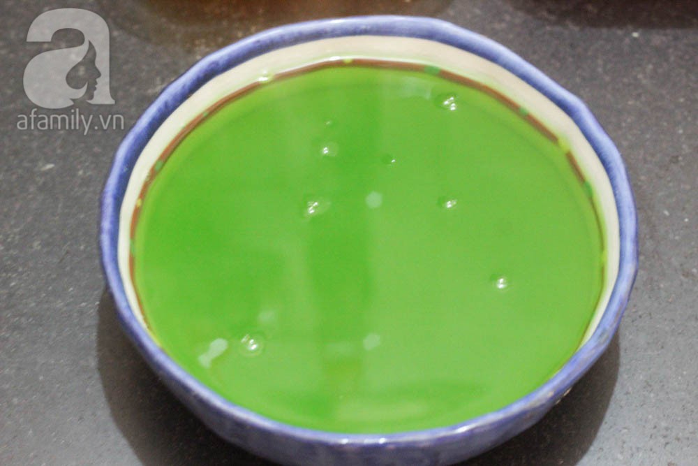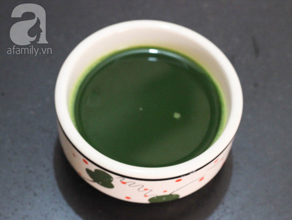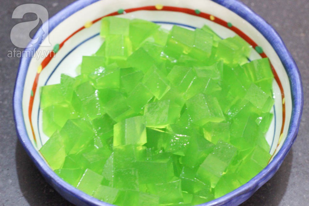 Trộn đều 5g bột thạch rau câu với 80g đường. Cho 500ml nước vào nồi đun sôi, đổ hỗn hợp đường và bột thạch vào nồi khuấy đều tay cho đường tan hết. Tắt bếp, đổ 10ml nước cốt lá dứa vào khuấy đều, đổ thạch ra khuôn chờ thạch đông.
