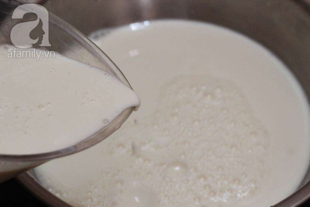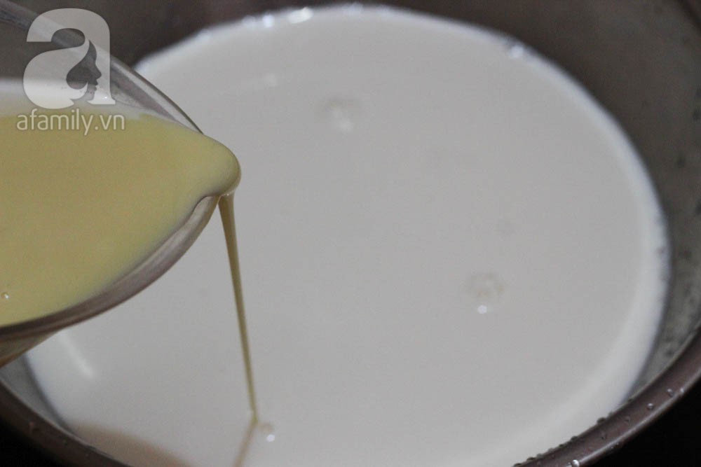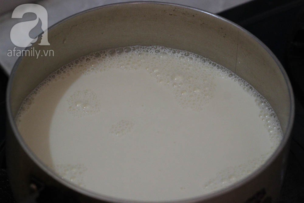 Đổ hỗn hợp sữa vào nồi đun đến khi sữa đạt khoảng 80 độ C thì bắc nồi ra khỏi bếp, đợi sữa nguội về khoảng 40 độ C.