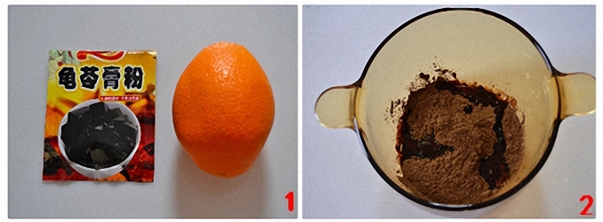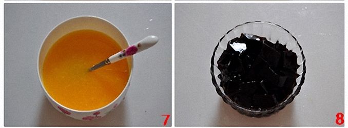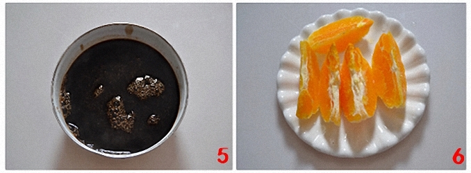 Lúc này, đổ hỗn hợp sương sáo vào khuôn hoặc một tô lớn. Cam bóc vỏ, lọc hạt rồi cho vào máy ép, hoặc các bạn có thể tự vắt bằng tay.