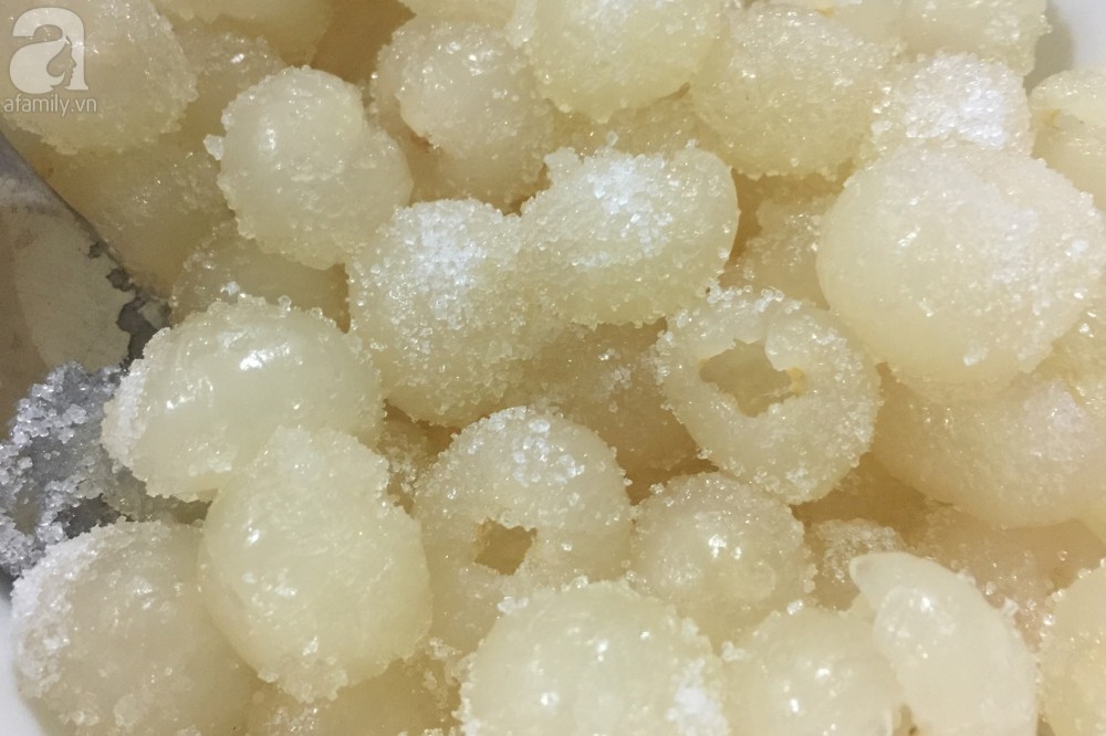 Bóc vỏ, tách hạt và rửa sạch nhãn. Ướp thịt nhãn với 40gr đường cát trong 20 phút.