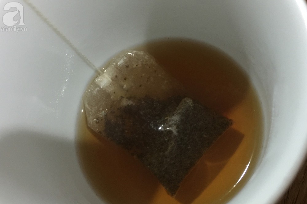 Chế 100ml nước nóng vào ly rồi nhúng 1 gói trà túi lọc vào. Chờ cho trà ngấm khoảng 5 phút.