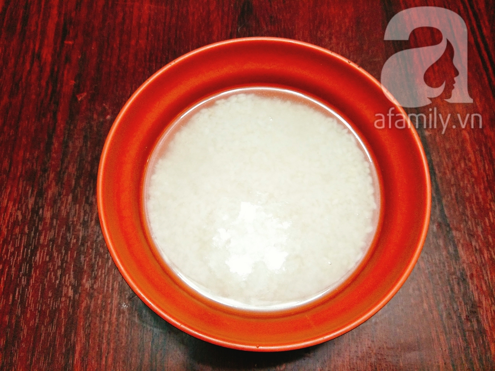 Gạo nếp vo sạch sẽ rồi ngâm nước qua đêm cho gạo nở mềm sau đó đổ ra cho ráo nước.