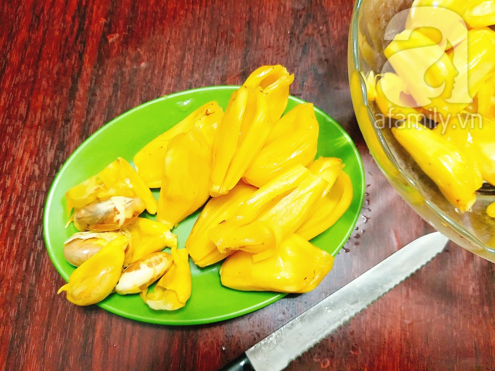 Dùng dao khía 1 đường dọc múi mít và nhẹ nhàng lấy hạt mít ra, sao cho múi mít còn nguyên vẹn, cứ như vậy bạn làm cho hết chỗ mít còn lại.