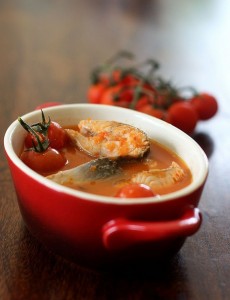 Thêm cá, đường, hạt nêm, tai chua (hoặc me) và cà chua bi, tiếp tục đun với lửa vừa trong khoảng 15 – 20 phút cho cá chín hẳn. Nêm nếm lại cho vừa ăn.