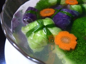 – Đun sôi nước dùng, cho bắp cải trắng cuộn thịt vào đun đến khi gần chín thì thả súp lơ, cà rốt, bắp cải tím cuộn thịt vào. Bắc ra ăn ngay (để lâu bắp cải tím sẽ tiết ra màu làm nước canh không được đẹp mắt)