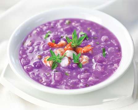 – Đun sôi 1 lít nước, nấu tôm vài phút cho ra nước ngọt, thêm khoai tím hạt lựu vào nấu 2 phút, cho khoai tím nạo vào, nêm 1/4m muối và 2M hạt nêm Ajingon, tắt lửa, thêm 1m nước mắm.