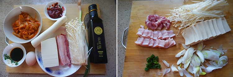 Chuẩn bị các nguyên liệu và sơ chế: thịt ba chỉ, đậu phụ cắt miếng vừa ăn; nấm cắt bỏ phần rễ, ngâm nước muối loãng; hành baro thái lát xéo.