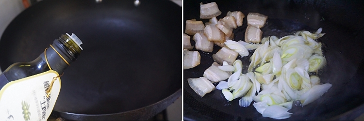 Bắc chảo lên bếp cùng chút dầu olive, sau đó cho hành baro và thịt ba chỉ vào xào thơm.