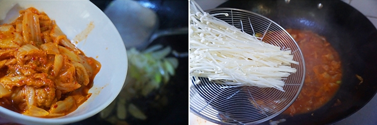 Tiếp đến cho kim chi vào đảo khoảng 15s thì đổ nước vào cùng ớt gochujang, chút muối. Bạn nhớ nêm nếm cho vừa vặn với khẩu vị gia đình mình nhé! Khi nước sôi thì thả nấm vào nấu chín.