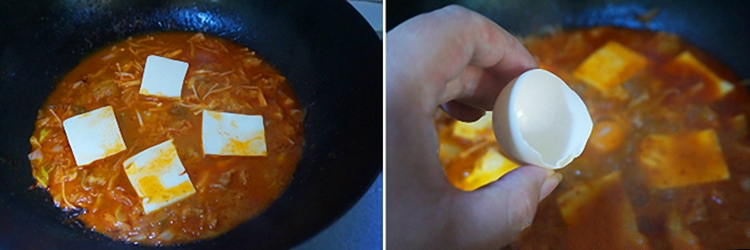Cuối cùng cho đậu phụ và đập trứng gà vào rồi tắt lửa, rắc hành lá lên và thưởng thức!