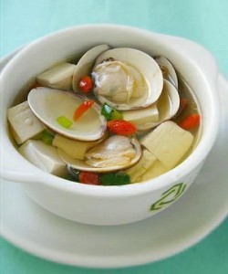 Khi ngao chín mở miệng thì cho đậu phụ xắt miếng vuông vào, chờ nước sôi trở lại thì cho hành mùi thái nhỏ. Tắt bếp nhấc xuống.