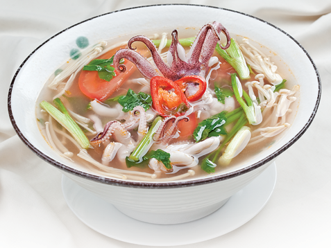 – Nấu sôi 1 lít nước, trút cà chua xào và mực vào nồi, thêm cà chua cắt múi cau, nấm kim châm, nêm 2m muối, 2m đường, 1m bột ngọt Aji-no-moto, 1m hạt nêm Aji-ngon, 1M nước mắm, thêm cần tàu và hành lá. Tắt lửa.