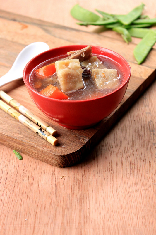 | Hớt bỏ bọt rồi cho sắn dây và cà rốt vào, nấu sôi lần nữa, chú ý vớt bọt nếu có bạn nhé! | |