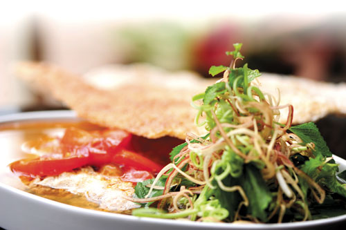 Ăn kèm rau muống bào, bắp chuối, rau thơm, giá và bánh tráng Bình Định.