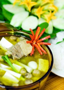 Lẩu vịt hầm sả ăn kèm với rau vườn và bún tươi. Điểm nhấn của món lẩu này chính là rau ăn kèm gồm rau mồng tơi non, bông bí, mướp.. và nước mắm gừng có cho vào thêm vài lát khế chua.