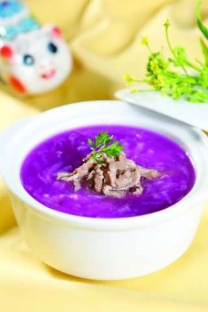 Đun sôi khoảng 500ml nước, trút khoai tím vào nấu sôi 5 phút, cho thịt bò vào đảo đều, tắt bếp.