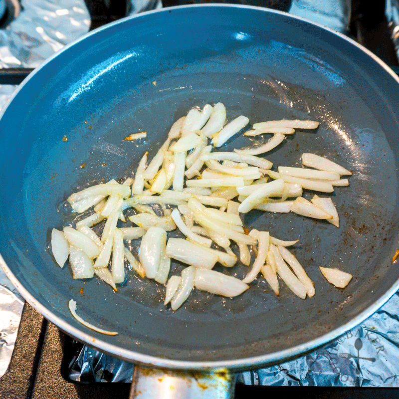 Cho dầu ăn vào chảo, thêm hành tây và nấm xào cho tái thì cho thịt gà vào xào tới khi thịt gà hết hồng thì cho giá đỗ vào xào cho chín.