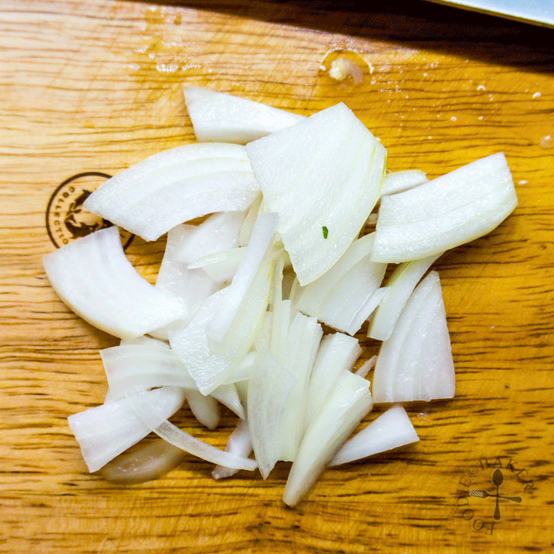 Thịt gà thái miếng nhỏ, nấm hương thái lát nhỏ, hành tây thái miếng mỏng.
