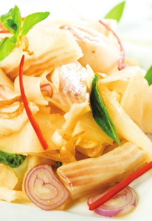 Cá trộn măng chua May 28, 2012 $ave Nguyên liệu: 150g cá lóc phi-lê 300g măng chua 3 củ hành tím 1 trái ớt sừng 1 thìa cà phê tỏi xay 1 thìa cà phê hành phi vàng 1 thìa súp nước cốt chanh 2 thìa cà phê nước mắm 2 thìa cà phê hạt nêm 2 thìa cà phê đườn 1/2 thìa cà phê tiêu 1 thìa cà phê tương ớt Rau ôm, lá quế Các bước thực hiện: Bước 1 Phi-lê cá lóc thái miếng vừa ăn, ướp nước mắm, hạt nêm, đường, tiêu, để thấm. Đặt chảo lên bếp, cho dầu ăn vào, phi thơm tỏi, cho cá vào xào chín. Tắt bếp, nhắc xuống. Bước 2 Măng chua cắt miếng vừa ăn, trụng chín, vớt ra để nguội vắt thật ráo. Rau om, lá quế thái nhỏ. Ớt bỏ hạt cắt sợi. Hành tím thái mỏng. Bước 3 Cho măng chua, ớt, hành tím, rau, vào tô. Cho nước cốt chanh, 1 thìa cà phê đường, 1 thìa cà phê tương ớt, 1 thìa cà phê hạt nêm, 1 thìa cà phê nước mắm vào trộn đều. Cuối cùng cho cá và hành phi vào trộn nhẹ tay để cá không bị nát. Cho cá trộn ra đĩa, rắc 1 ít lá quế và hành phi lên mặt. Nguồn từ trang: amthuc365