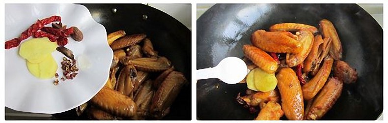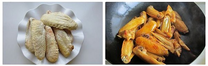 Cánh gà mua về rửa sạch sau đó bắc lên bếp luộc sơ qua rồi vớt ra để ráo. Bắc chảo lên bếp cùng chút dầu ăn, sau đó cho đường phèn vào cho dầu chuyển màu nâu rồi cho cánh gà vào đảo đều.