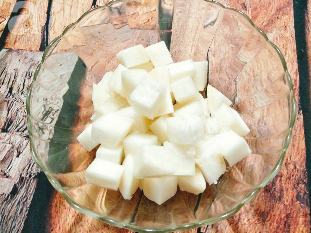Củ cải đem rửa thật sạch sau đó gọt vỏ, cắt khối vuông nhỏ vừa ăn, không quá to.