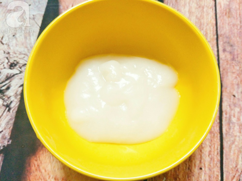 Trong khi đó bạn nấu phần bột nếp để trộn cùng gia vị, cho bột nếp vào nồi cùng với vài thìa nước rồi khuấy đều. Bật bếp đun lửa nhỏ vừa nấu vừa khuấy liên tục cho tới khi hỗn hợp sôi lên là tắt bếp, chúng ta được phần bột nếp hơi đặc. Để cho nguội hẳn.