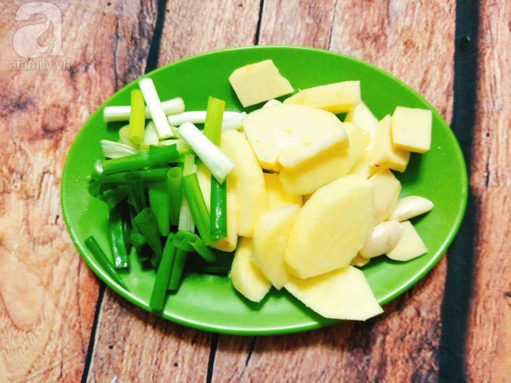 Hành lá rửa sạch để ráo nước rồi đem thái khúc. Táo rửa sạch rồi gọt vỏ, bỏ lõi sau đó cắt miếng nhỏ. Gừng gọt vỏ rồi thái miếng nhỏ, tỏi bóc sạch vỏ cắt nhỏ.