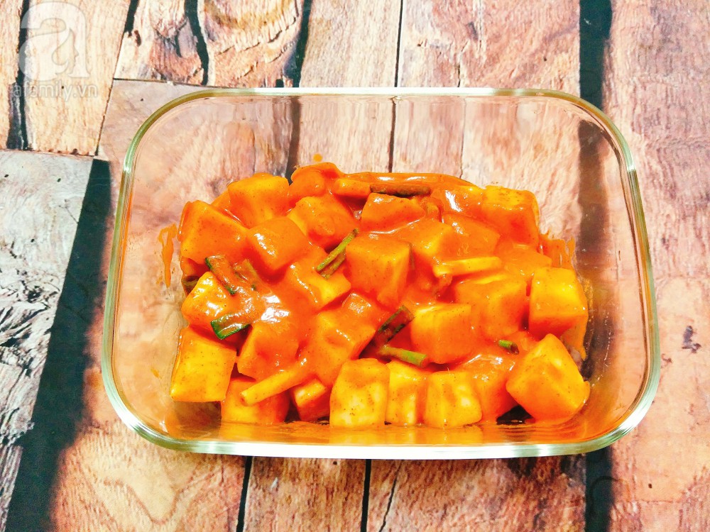Cho củ cải, hành lá vào tô to sau đó đổ nguyên liệu vừa xay nhuyễn vào cùng và trộn thật đều. Đổ vào hộp thủy tinh và đậy nắp ngâm 2 ngày ở nhiệt độ thường là có thể ăn được.