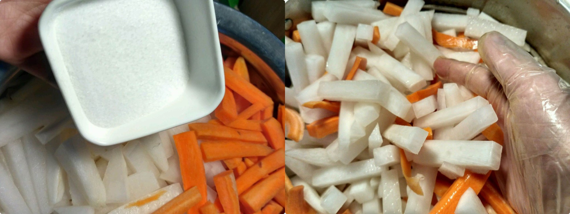 Thêm 50g muối vào âu củ cải trộn đều và ngâm trong 2 giờ.