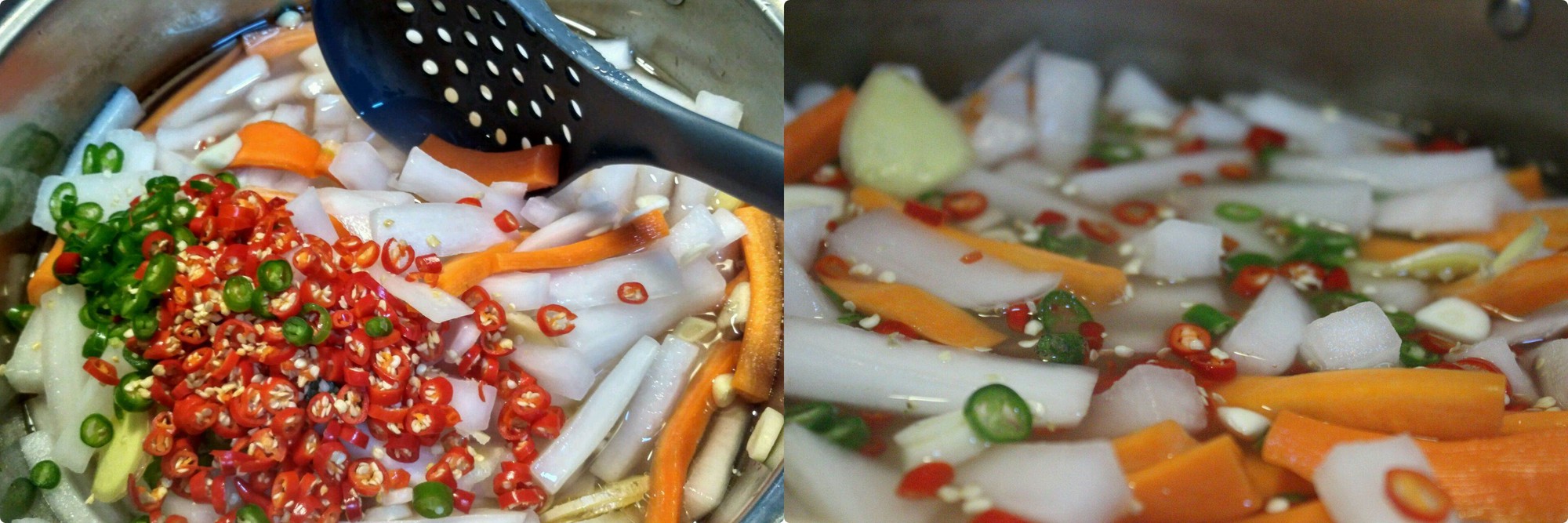 Đổ bát nước giấm đường vào âu củ cải, cà rốt. Sau đó thêm ớt thái nhỏ vào trộn đều. Bạn cho củ cải, cà rốt đã trộn vào hũ đóng kín khoảng 5-7 ngày là có thể dùng được.