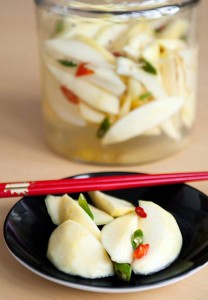 – Xếp xoài vào hũ hoặc lọ rùi cho ớt thái lát. Nếu không ăn được cay thì các bạn có thể không cho ớt!
