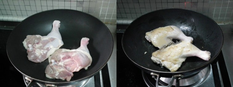 Đùi gà mua về rửa sạch, để thật ráo nước. Sau đó bắc chảo lên bếp cùng một lượng dầu vừa phải, khi dầu nóng đều thì cho đùi gà vào rán vàng hai mặt thì vớt gà ra.