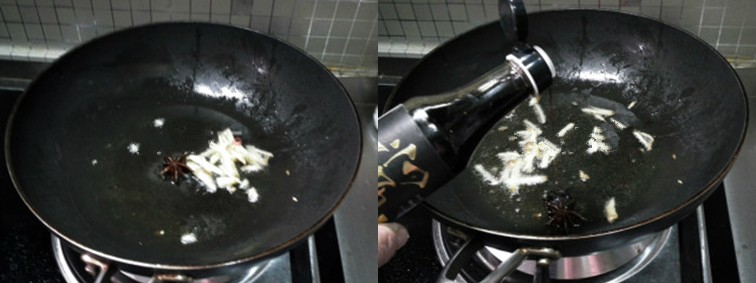 Tiếp đến bạn thêm chút dầu ăn vào nồi và cho hoa hồi, gừng, hành baro thái lát vào phi thơm rồi cho nước mắm, nước tương vào khuấy đều.