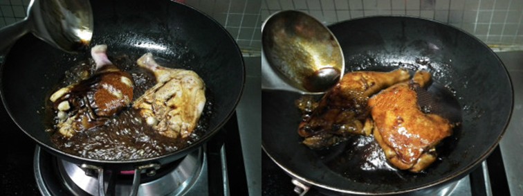 Thêm đường phèn vào nấu cho đến khi tan chảy hoàn toàn thì bạn cho đùi gà vào rim. Dùng muôi để rưới phần hỗn hợp sốt lên thân gà cho thấm đều vào thịt.