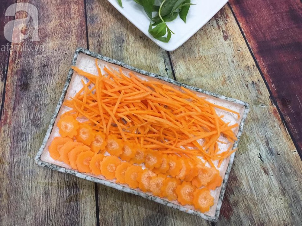 Cà rốt gọt vỏ, bào sợi, có thể chừa lại một ít tỉa hỏa và cắt mỏng 1-2mm để trang trí.