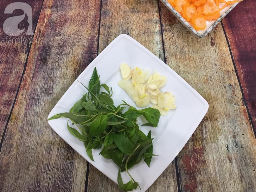Rau răm rửa sạch, thái nhỏ. Tỏi bóc vỏ, thái lát.