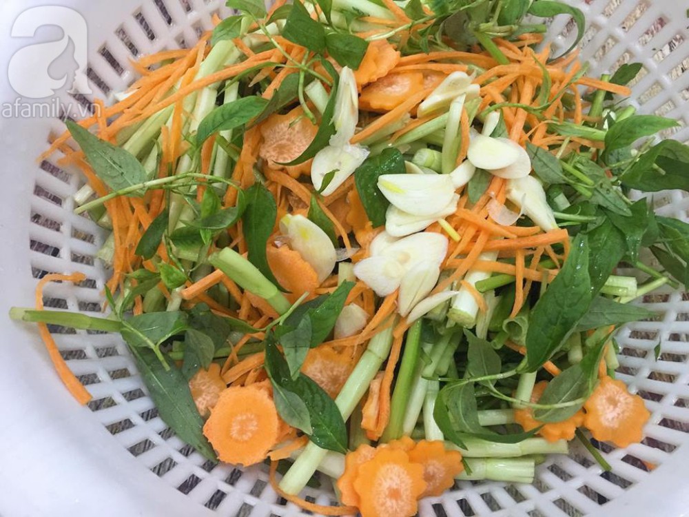Cho rau cần, tỏi, cà rốt vào rau răm vào trộn thật đều.