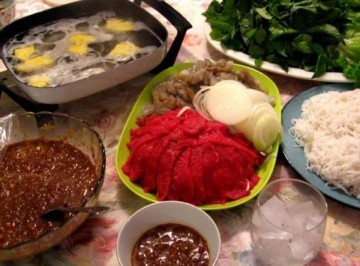 Thịt bò nhúng giấm May 11, 2012 $ave Nguyên liệu: 800g thăn bò nõn 500g mì giấm chua 2 trái chanh 1 trái dứa 1 chai mắm nêm 3 xắp bánh tráng Rau sống (dưa chuột, rau thơm, xà lách, giá sống, chuối chát, khế chua) Các bước thực hiện: Bước 1 Thịt bò xắt lát mỏng (cố gắng xắt thật mỏng, đừng để cho thịt vụn). Ướp thịt với hành củ xắt mỏng và chút gia vị rồi để thấm chừng 30 phút. Bước 2 Dứa gọt vỏ, bỏ mắt, băm nhỏ rồi để ra một tô lớn. Giã tỏi cùng với thơm vào quậy đều. Nêm nếm xem vị mặn, ngọt của mắm rồi chia đều ra 4 chén nhỏ. Bước 3 Xà lách tách từng bẹ, rau thơm nhặt bỏ cọng, giá sống chặt bỏ mũi, dưa leo xắt lát dài, chuối chát và khế xắt lát mỏng ngâm với nước cho trắng. Rửa sạch rau sống rồi vẩy nước cho thật khô. Bước 4 Đổ nước của trái dừa non cho vào nồi lẩu cùng với ít giấm, đường, gia vị. Đun sôi, đặt ra giữa bàn. Xếp thịt bò xung quanh cùng với rau sống, mắm nêm, bánh tráng. Nguồn từ trang: amthuc365