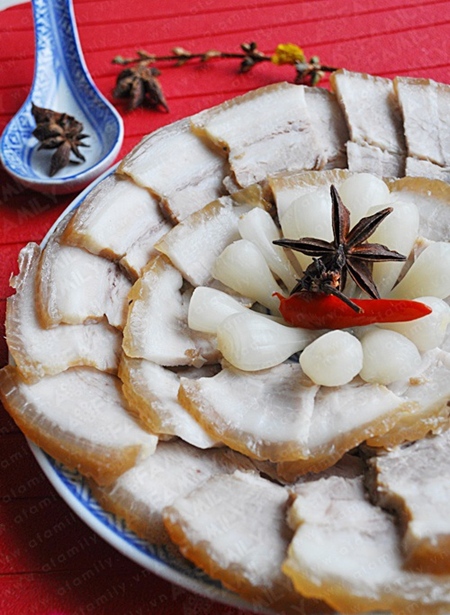 Cho tất cả nguyên liệu vào nồi, thêm chút nước, nấu cho đến khi thịt chín mềm. Công đoạn này gần giống như kho thịt. Sau đó, vớt thịt ra, cho ngay vào tô nước lạnh có đá lạnh nhằm mục đích làm cho mỡ trong và giòn.