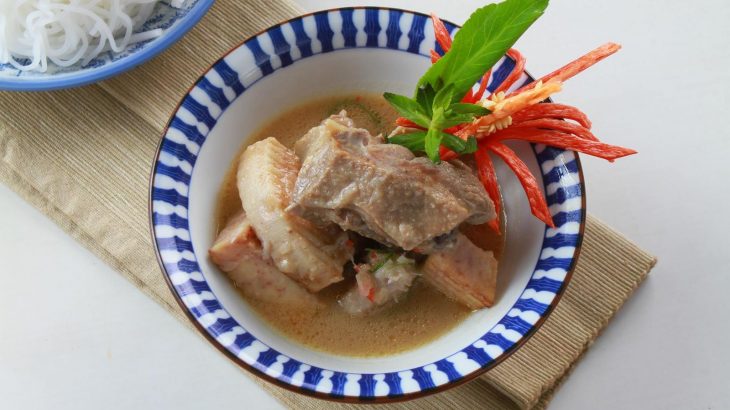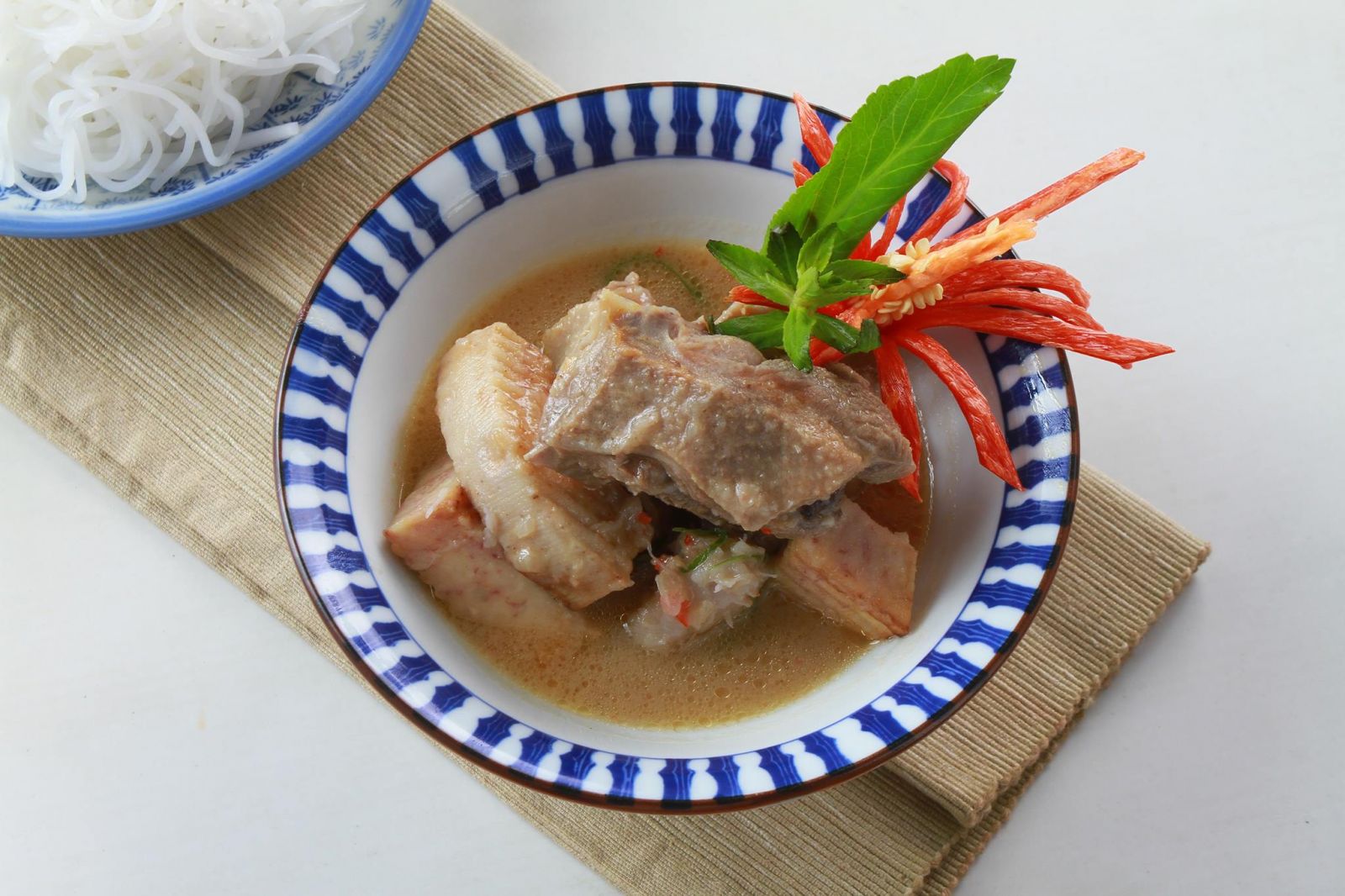 • nước dừa, gừng, rượu trắng, muối, đường, nước mắm, hạt nêm, hành tím băm, tỏi băm, hạt tiêu, hành lá. Bún, rau xà lách ăn kèm