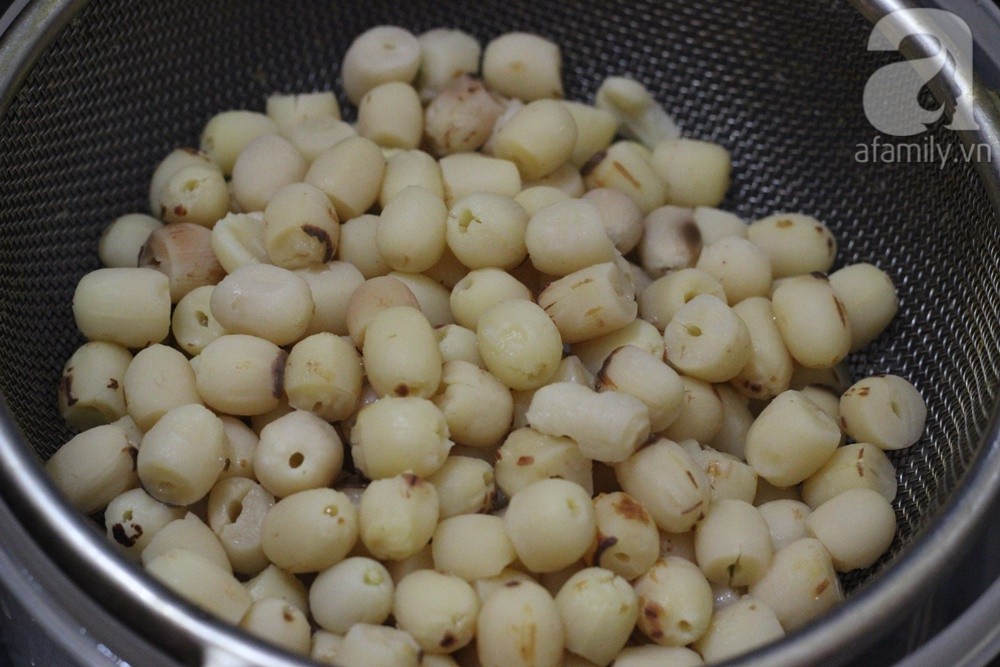 Cho hạt sen vào nồi, đổ nước ngập hạt sen rồi đun sôi. Khi hạt sen sôi, vặn nhỏ lửa và ninh đến khi hạt sen chín mềm.