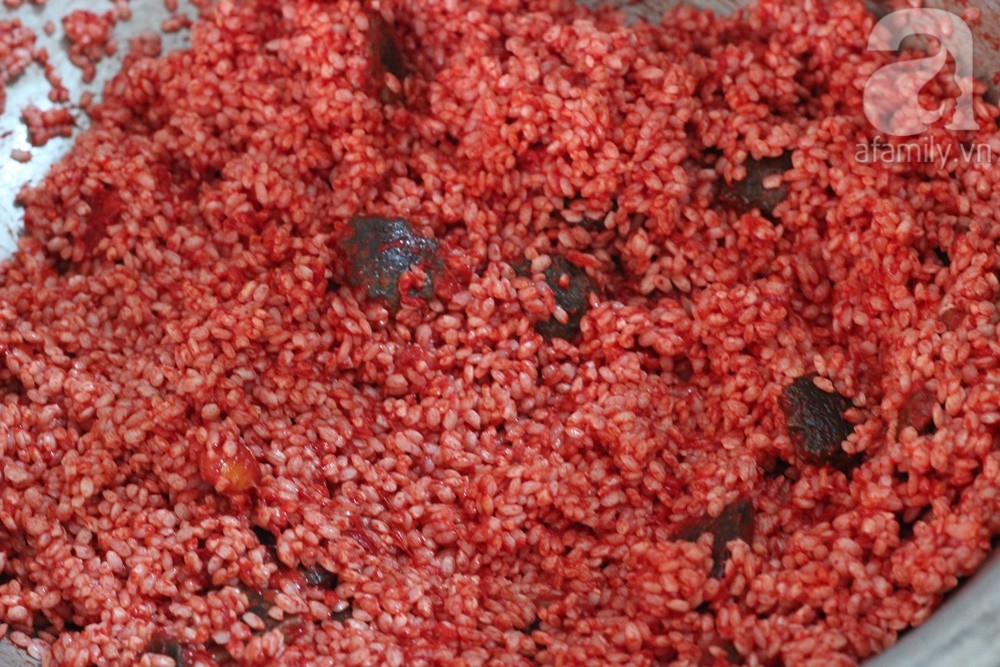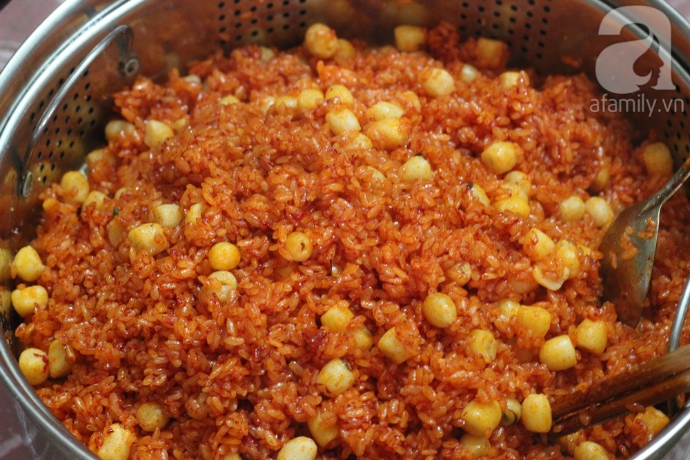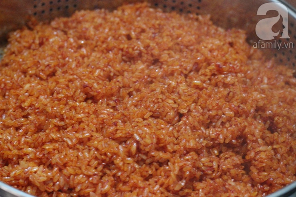 Gạo nếp sau khi ráo nước thì đổ vào âu to, cho thêm chút dầu ăn vào trộn đều. Cắt đôi quả gấc, lấy phần hạt trộn với gạo nếp. Trộn đều hạt gấc với gạo nếp cho gạo có màu đỏ đẹp, sau đó nhặt bỏ hết hạt gấc.