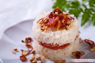 Xôi chín dẻo mềm, lạp xưởng thịt nguội thơm phức, màu sắc hấp dẫn.