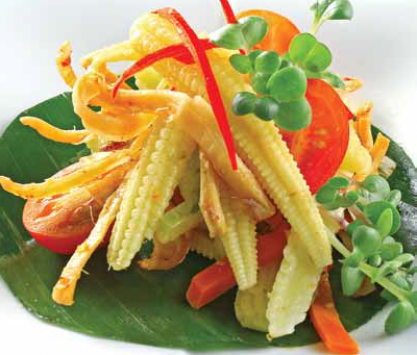 Cà chua bi cắt đôi. Vớt bắp, cà rốt, khế ra, để ráo, sau đó cho cà chua bi, rau mầm, mực và nước trộn vào, trộn đều. Dọn ra đĩa, dùng như món khai vị.