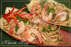 – Tôm hấp chín, bỏ vỏ, đầu, chừa đuôi tôm cho đẹp.